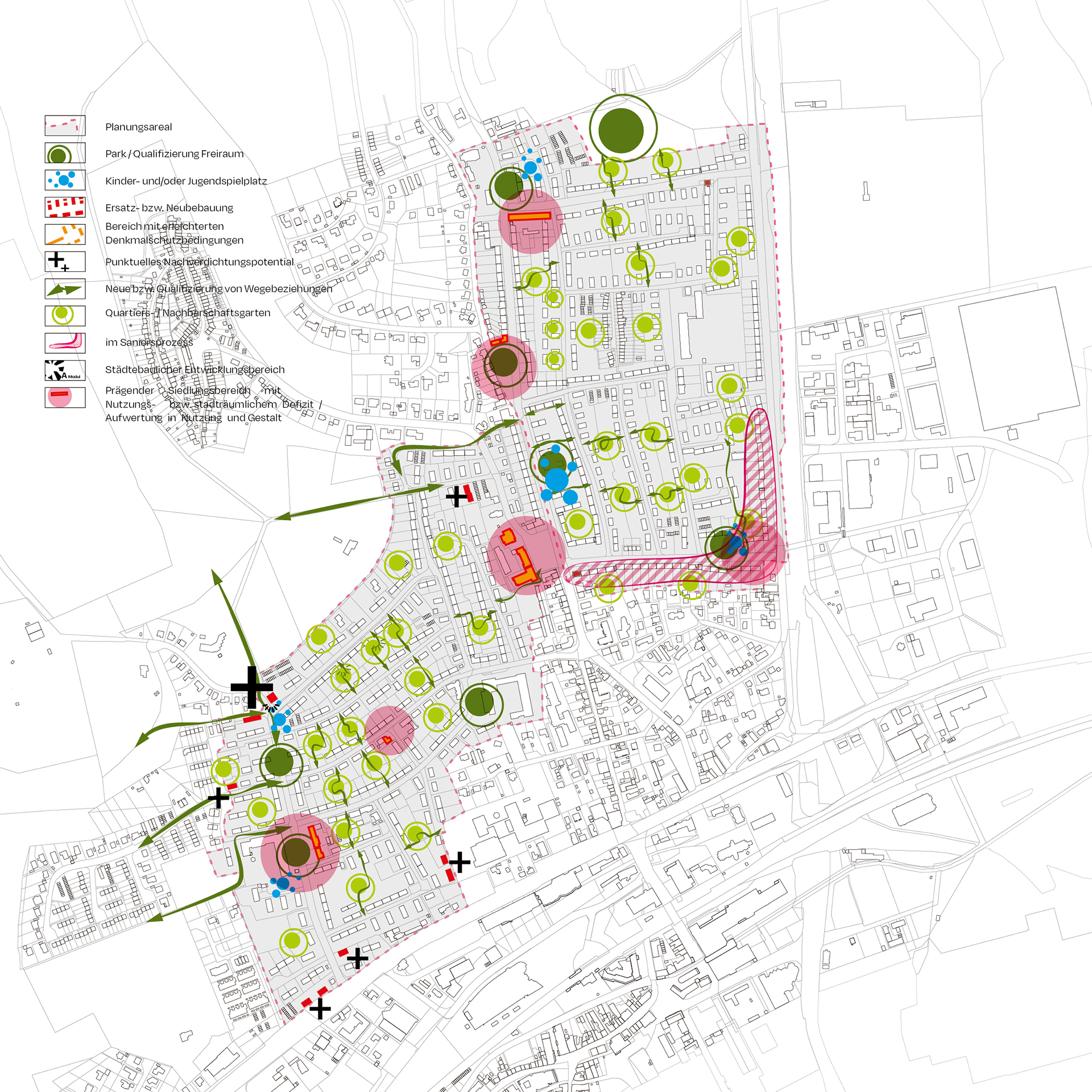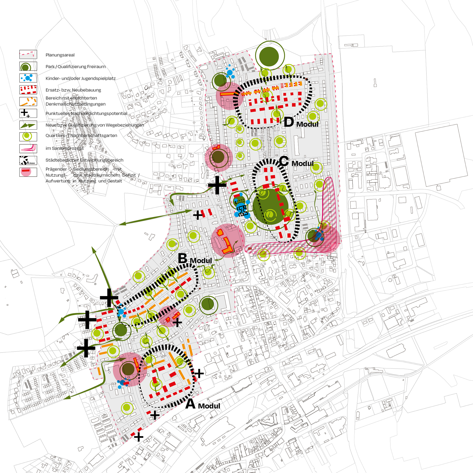 Ziel dabei ist, die städtebauliche Grundstruktur der Siedlungen zu erhalten und dabei Bereiche einzugrenzen, von denen durch eine städtebauliche Transformation unterschiedlich starke Entwicklungsimpulse initiiert werden können.