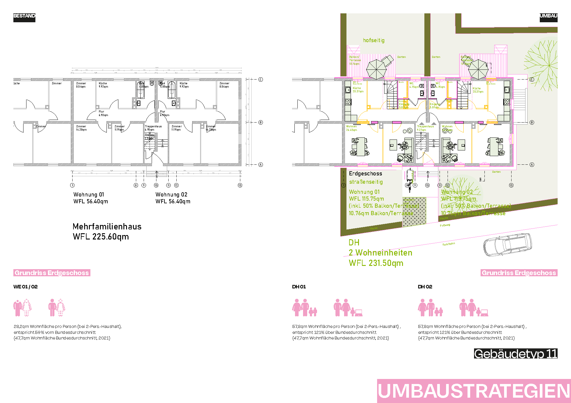 Allen Szenarien ist gemeinsam, dass je nach Schwerpunktsetzung, zeitgemäße Wohnformen realisiert werden sollen. Dabei gibt es graduelle Abstufungen. In Szenario 01 wird davon ausgegangen, dass die bestehenden Gebäude denkmalgerecht modernisiert werden, um Grundrissanpassungen zu erreichen. Szenario 02 ermöglicht zusätzlich Ersatzneubauten und in Szenario 03 werden in ausgewählten Bereichen eigenständige Architekturen vorgeschlagen, welche die Materialität und Anmutung der Bestandsbebauung interpretieren. In beiden Siedlungen soll ein Angebot von unterschiedlichen Wohnformen für Singles, Paare, unterschiedliche Familienkonstellationen, Haushaltsgrößen, Wohngruppen, Baugruppen, Mehrgenerationenwohnen und weiteren Lebensstilen bereitgestellt werden.