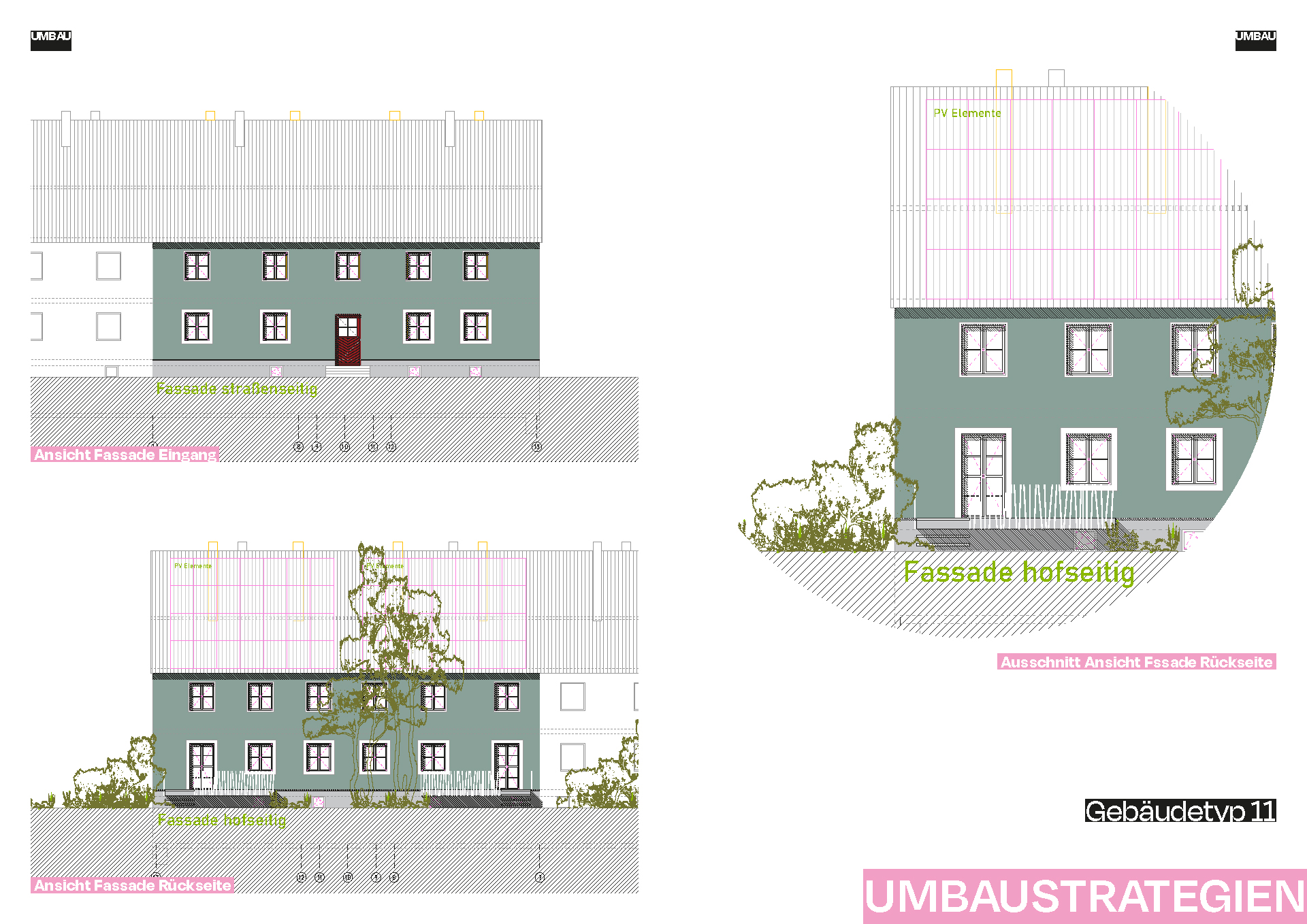 Für die städtebaulichen Grundsatzüberlegungen der Szenarien wurden abgestufte Gestaltungsrichtlinien für die Gebäudesanierung und modellhafte Grundrissmodernisierungen für ausgewählte Gebäudetypen der Siedlung entwickelt. Sie dienen als Orientierung und Hilfestellung für die konkrete Umsetzung des Konzeptes. Entsprechende Details sind dem Konzept in der Hauptfassung zu entnehmen.
