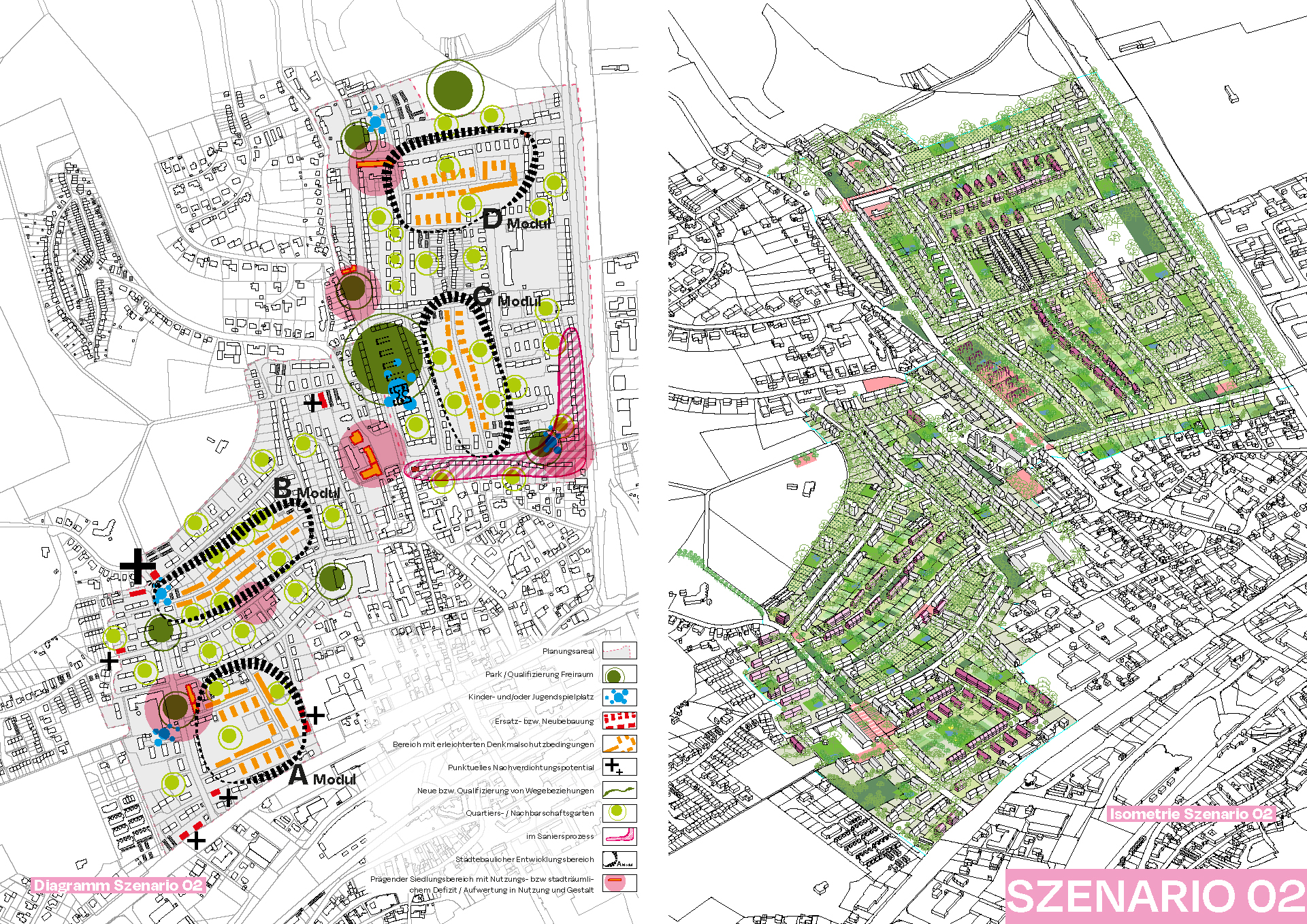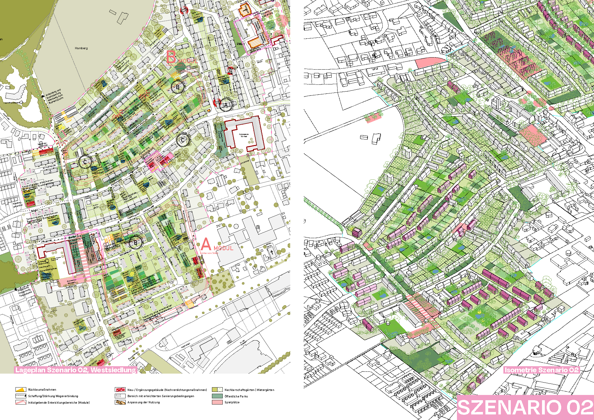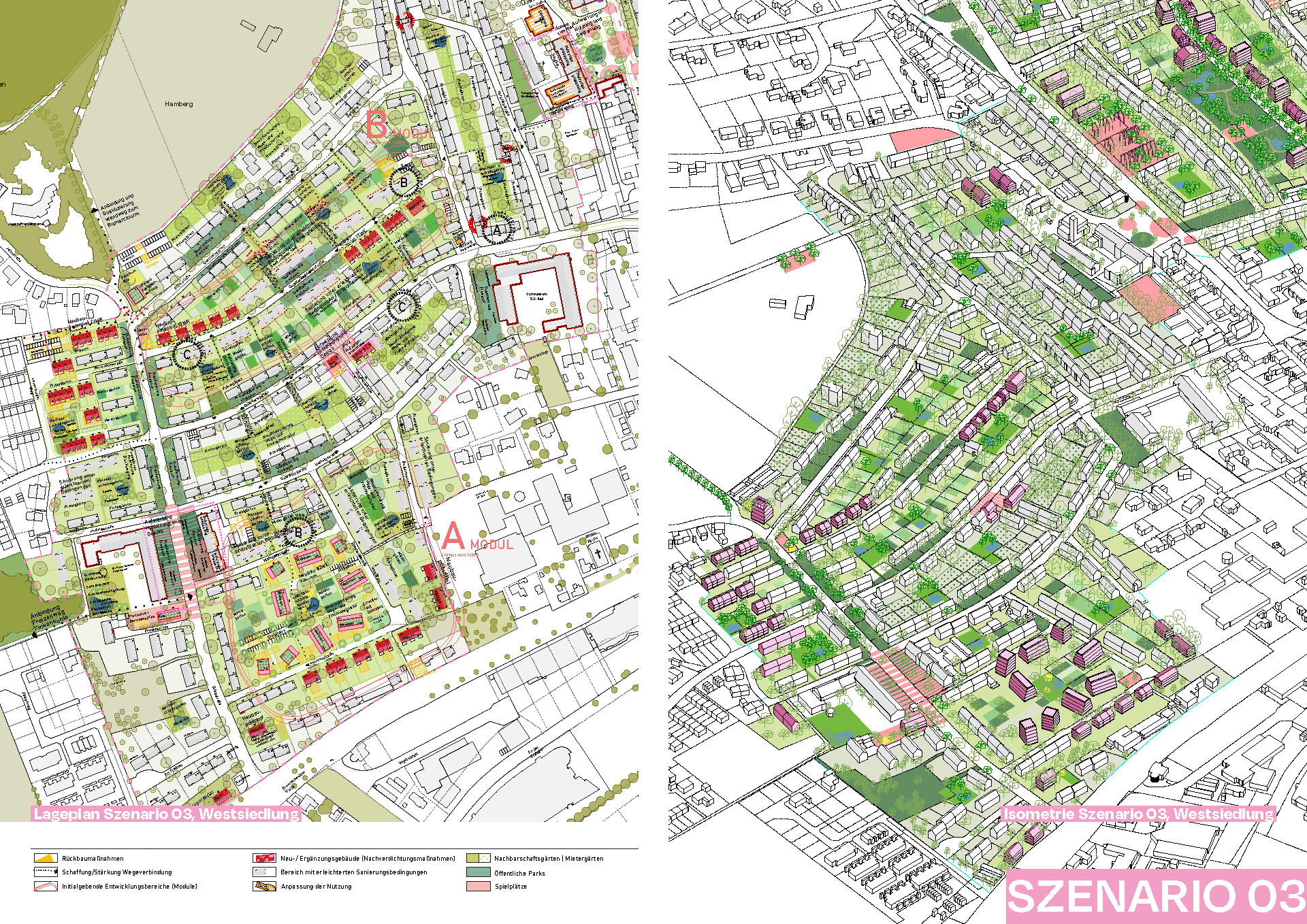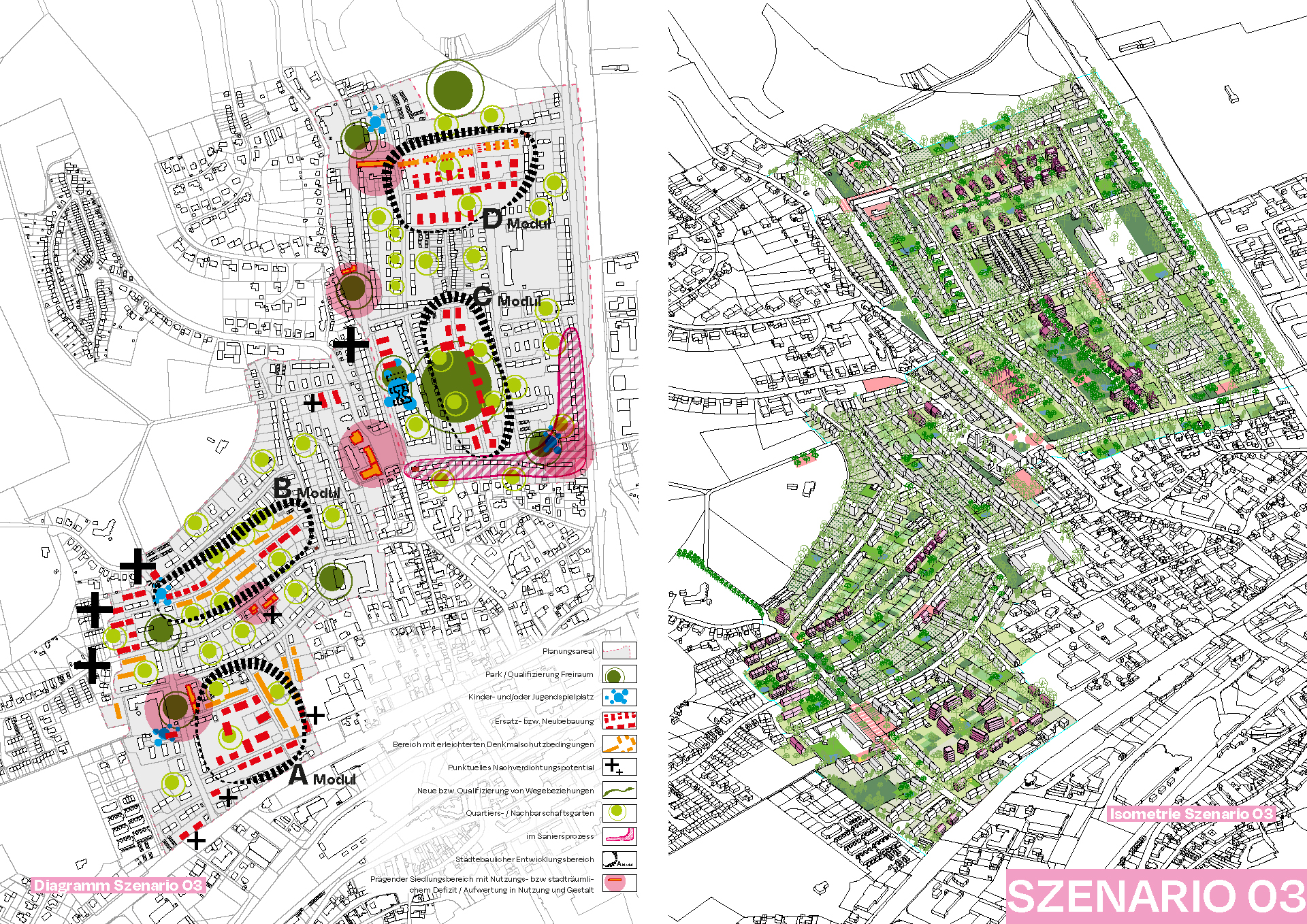 Sowohl in der Ost- als auch in der Westsiedlung werden Teilbereiche überwiegend der 3. Ordnung definiert, für die jeweils in Szenario 02 und 03 unterschiedlich intensive baulich – räumliche Maßnahmen vorgeschlagen werden. Hierbei handelt es sich um Teilräume, die bisher in der städtebaulichen Struktur weniger von Bedeutung oder weniger gut in das Gesamtbild integriert sind, sowie um rückwärtige oder isolierte Lagen. Nachfolgend werden diese als Module bezeichnet.
