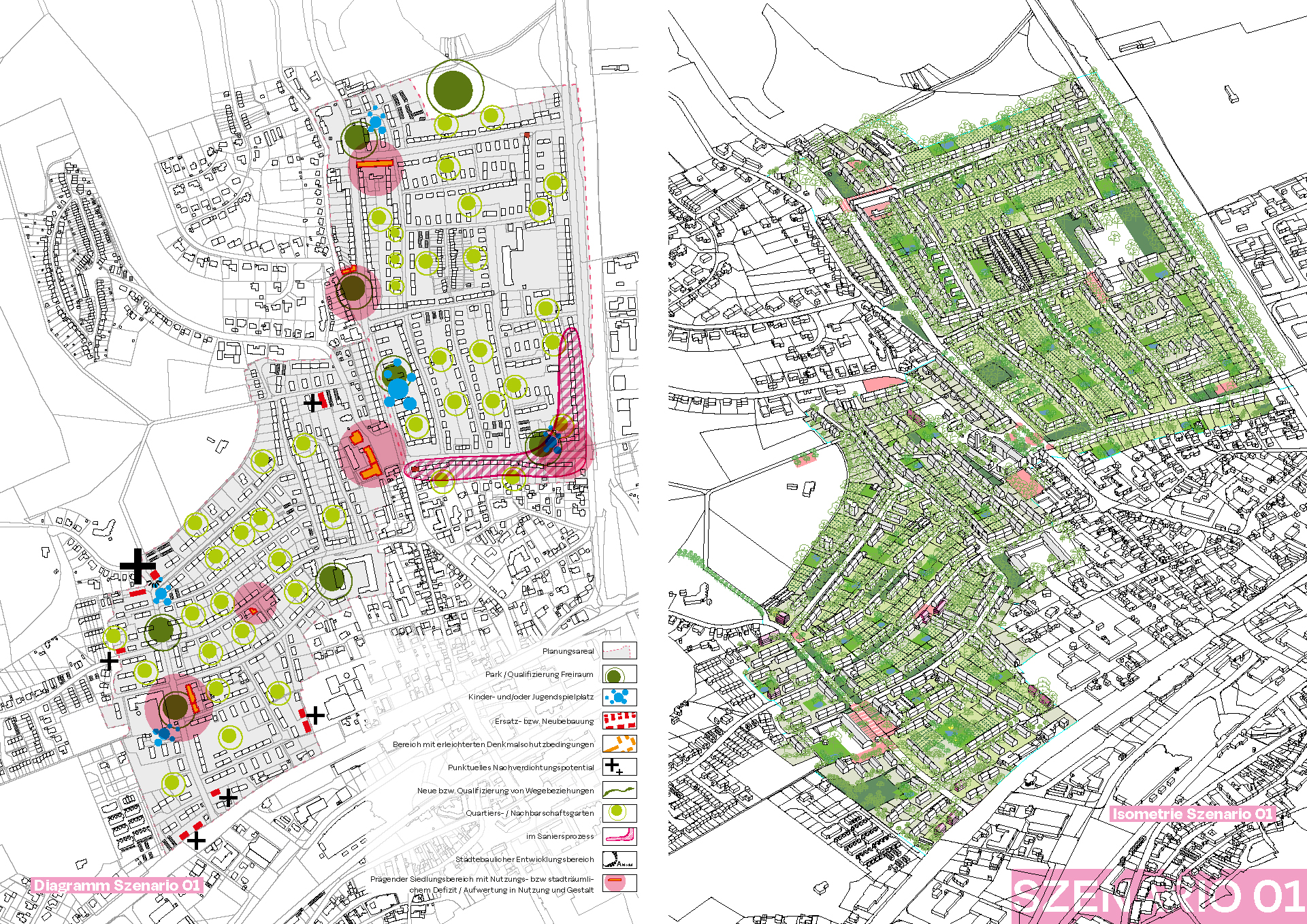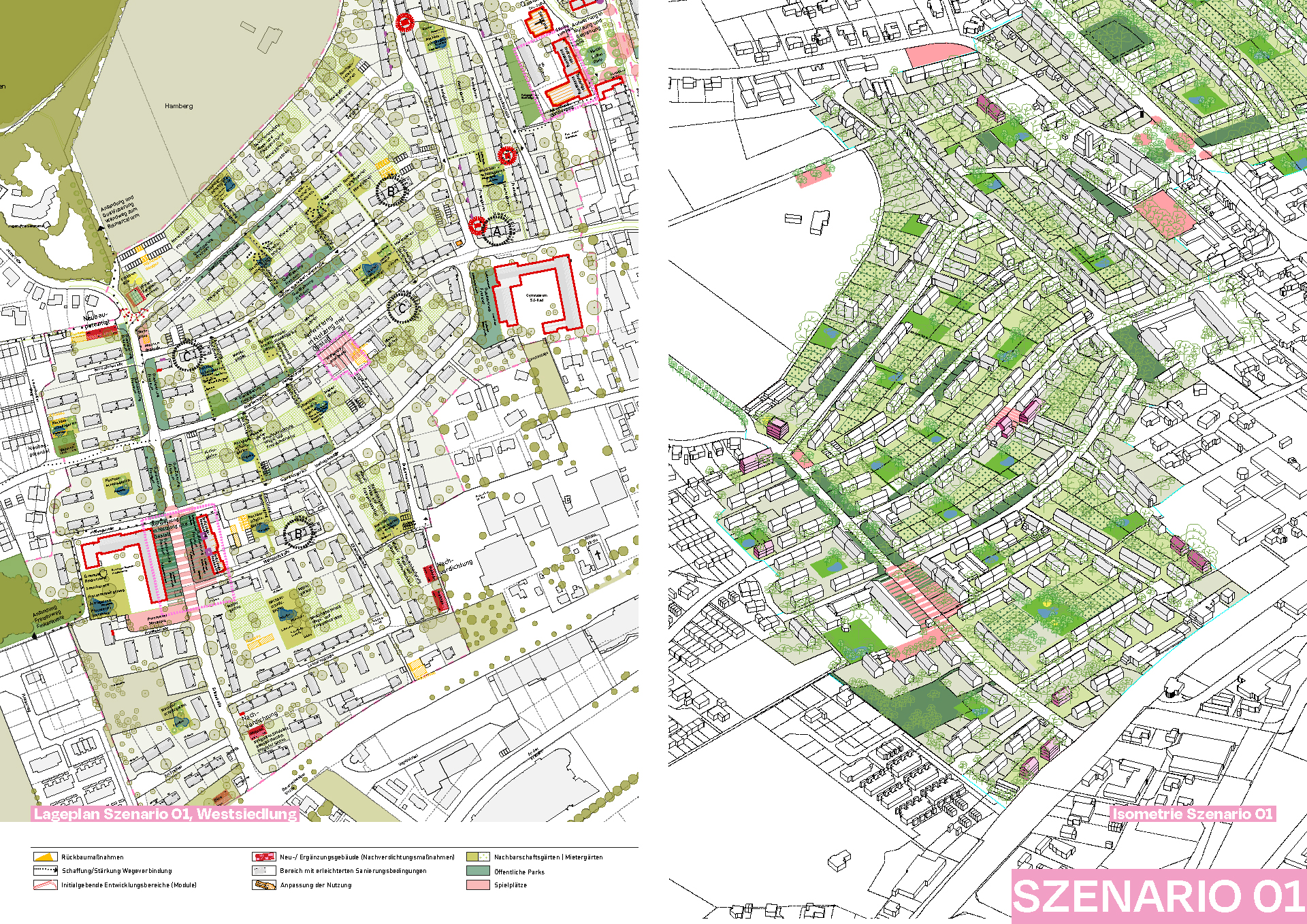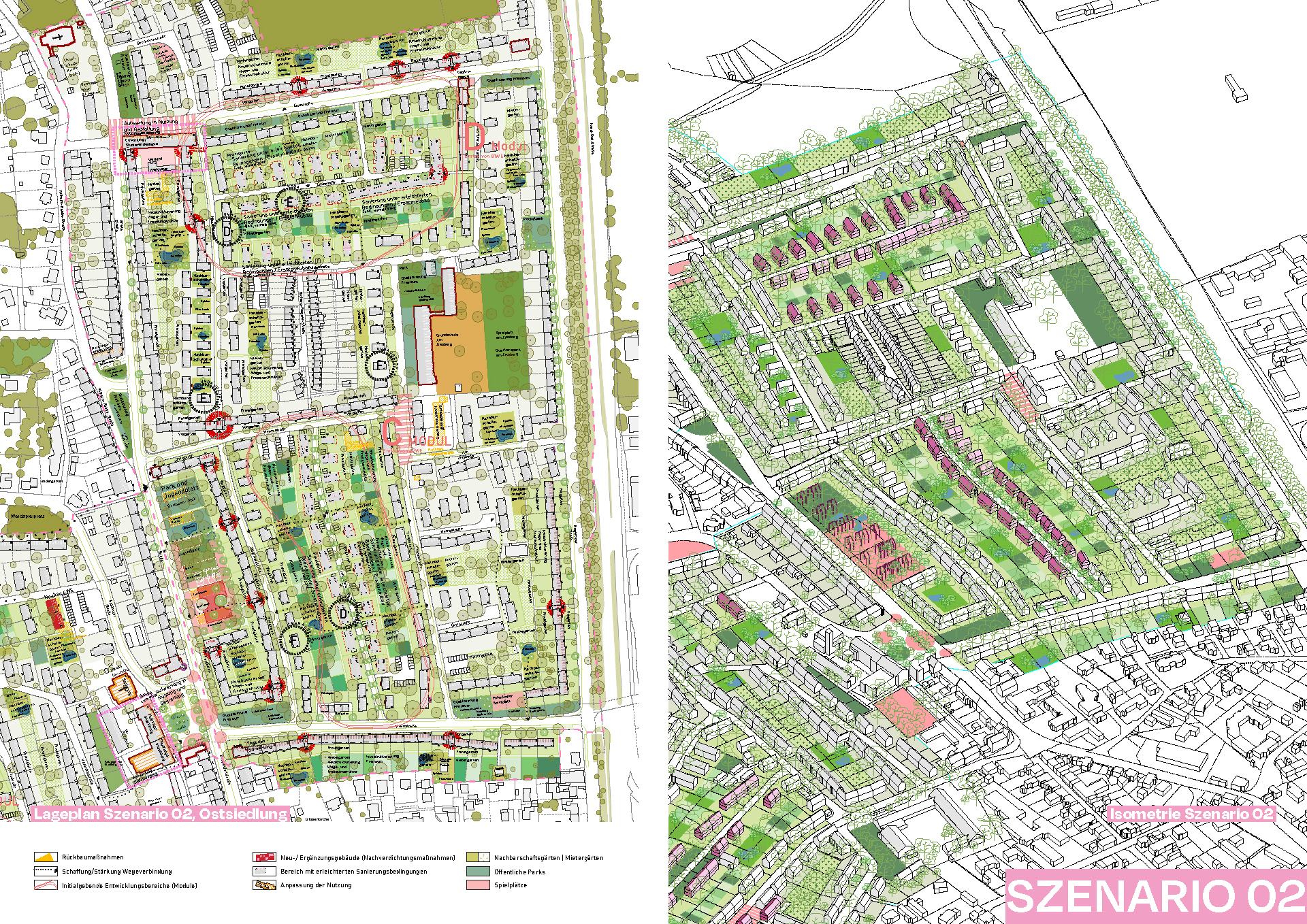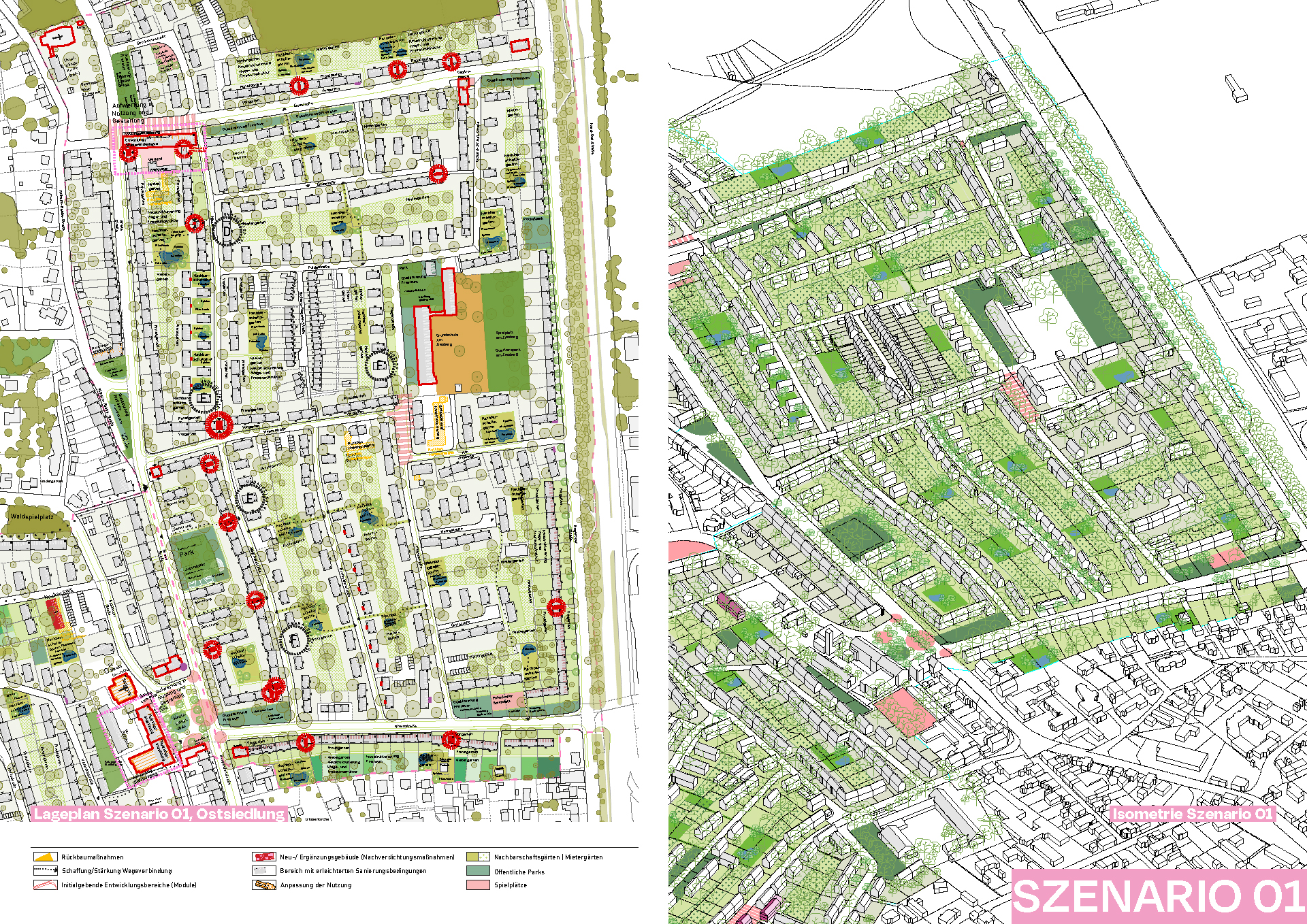 Allen Szenarien ist gemeinsam, dass je nach Schwerpunktsetzung, zeitgemäße Wohnformen realisiert werden sollen. Dabei gibt es graduelle Abstufungen. In Szenario 01 wird davon ausgegangen, dass die bestehenden Gebäude denkmalgerecht modernisiert werden, um Grundrissanpassungen zu erreichen. Szenario 02 ermöglicht zusätzlich Ersatzneubauten und in Szenario 03 werden in ausgewählten Bereichen eigenständige Architekturen vorgeschlagen, welche die Materialität und Anmutung der Bestandsbebauung interpretieren. In beiden Siedlungen soll ein Angebot von unterschiedlichen Wohnformen für Singles, Paare, unterschiedliche Familienkonstellationen, Haushaltsgrößen, Wohngruppen, Baugruppen, Mehrgenerationenwohnen und weiteren Lebensstilen bereitgestellt werden.