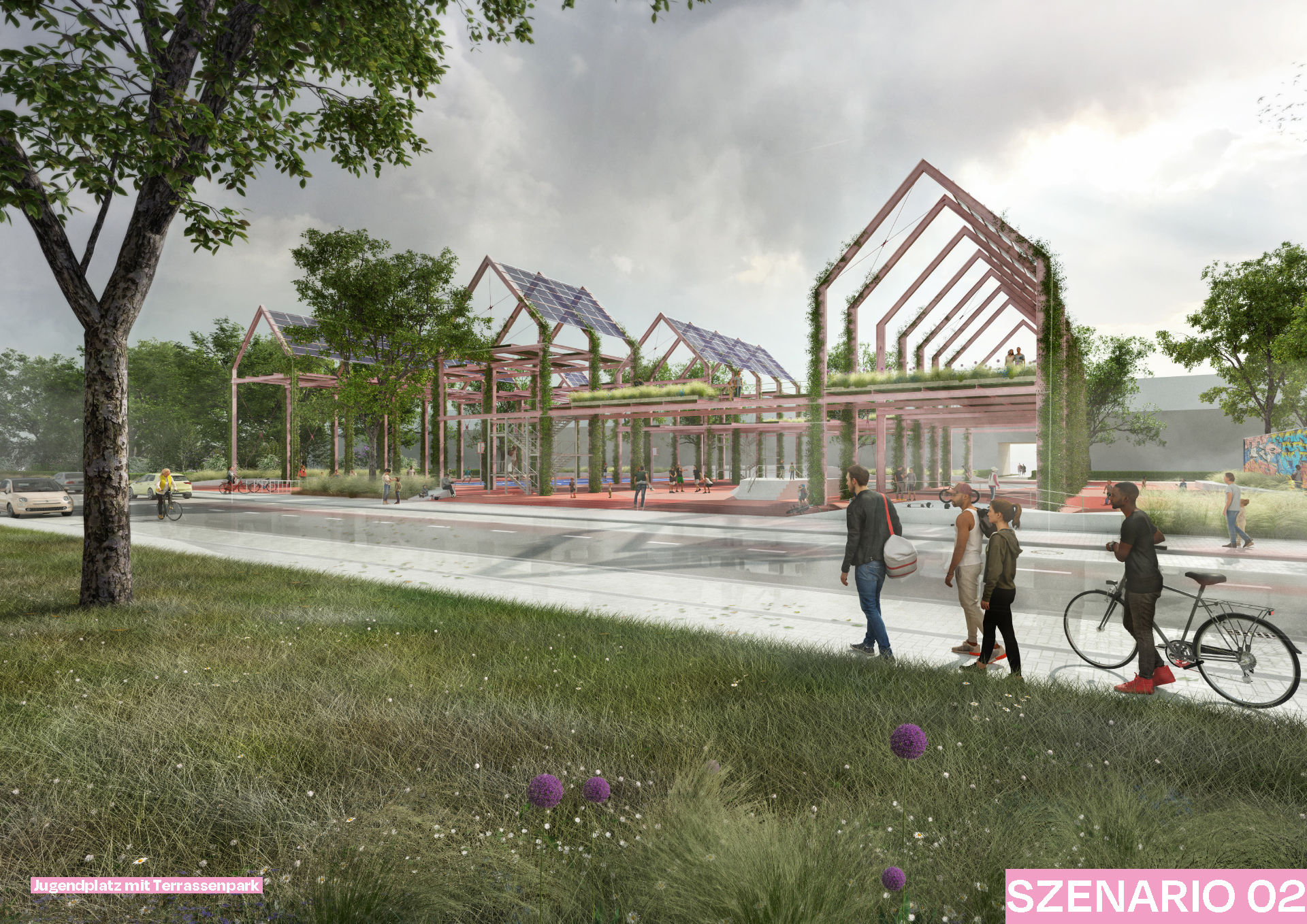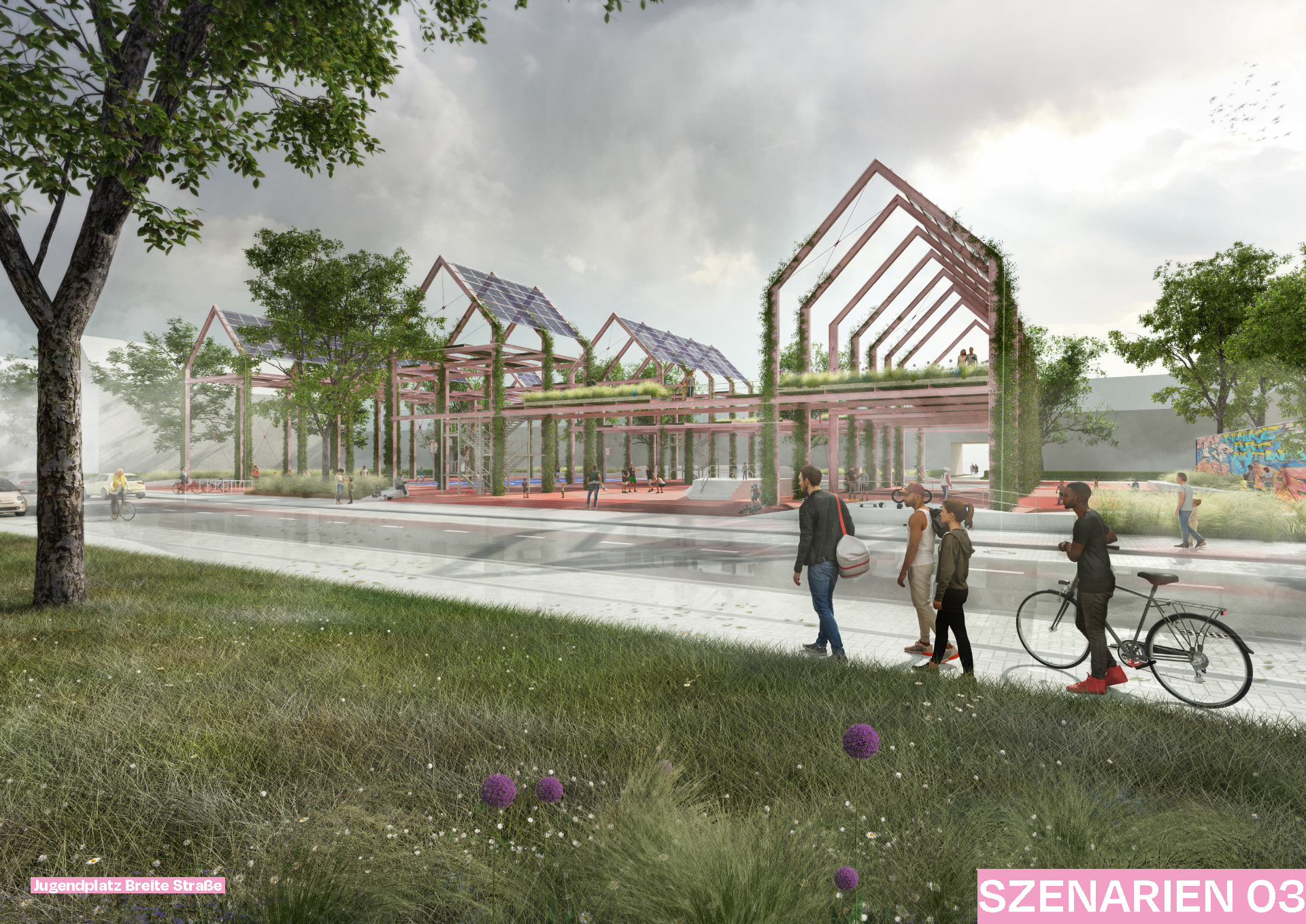An der Breiten Straße, nördlich des Martin Luther Platz entsteht östlich ein zentraler Park mit Jugendplatz. Die bereits beschädigten Gebäuden werden sensibel zurückgebaut. Dabei können z.B. Teile der Außenwände erhalten und in die Gestaltung des Parks integriert werden. Ein Jugendplatz mit Sportflächen zum Skaten und Basketball wird vorgesehen.