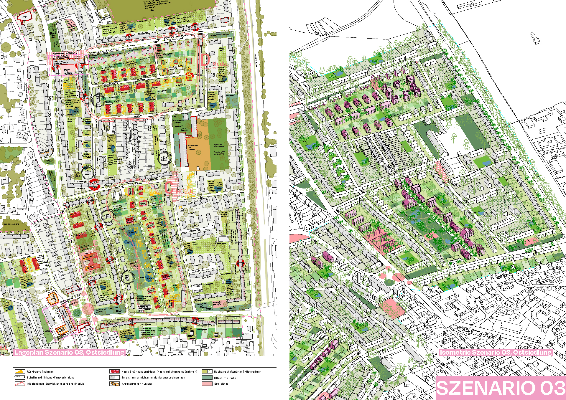 Bei dem vorliegenden, standortbezogenen Immobilienentwicklungskonzept der Ost- und Westsiedlung wird mit drei Szenarien gearbeitet, die hinsichtlich ihrer baulich räumlichen Ausbildung jeweils unterschiedliche Schwerpunkte aufweisen. Die Ausarbeitung von drei differenzierten Szenarien (Herangehensweisen) stellt eine Grundlage für die Bewertung dar, wie weitreichend eine zukünftige Transformation von Siedlungsbereichen städtebaulich greifen soll. Alle Szenarien folgen jedoch der Prämisse, dass die städtebauliche Struktur beider Siedlungen grundsätzlich gewahrt bleiben soll.