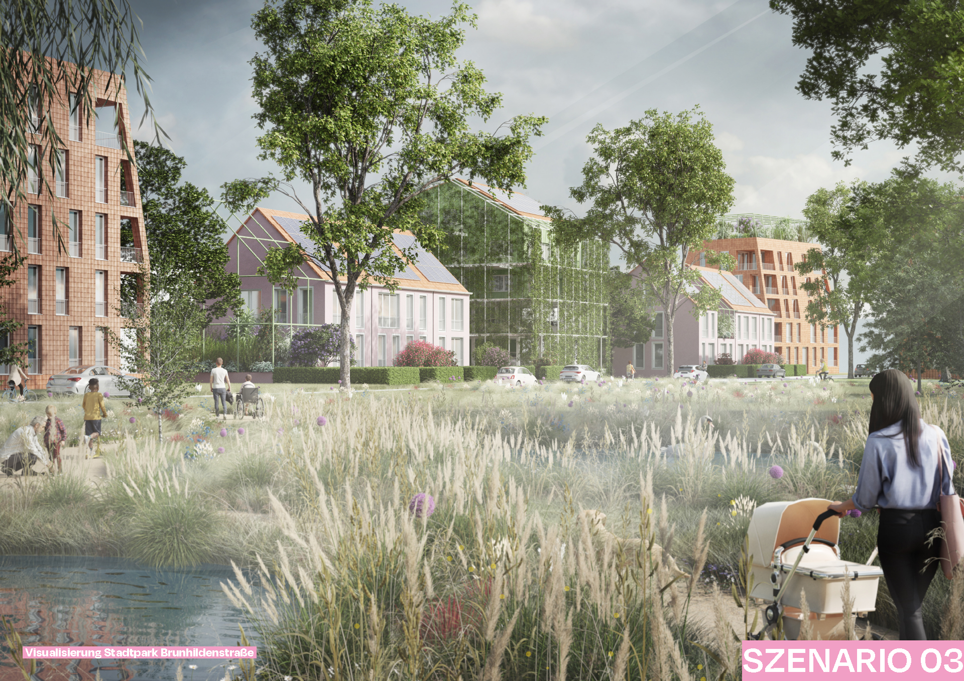 Auf der Westseite der Brunhildenstraße werden Wohngebäude zugunsten eines großzügigen Parks zurückgebaut.