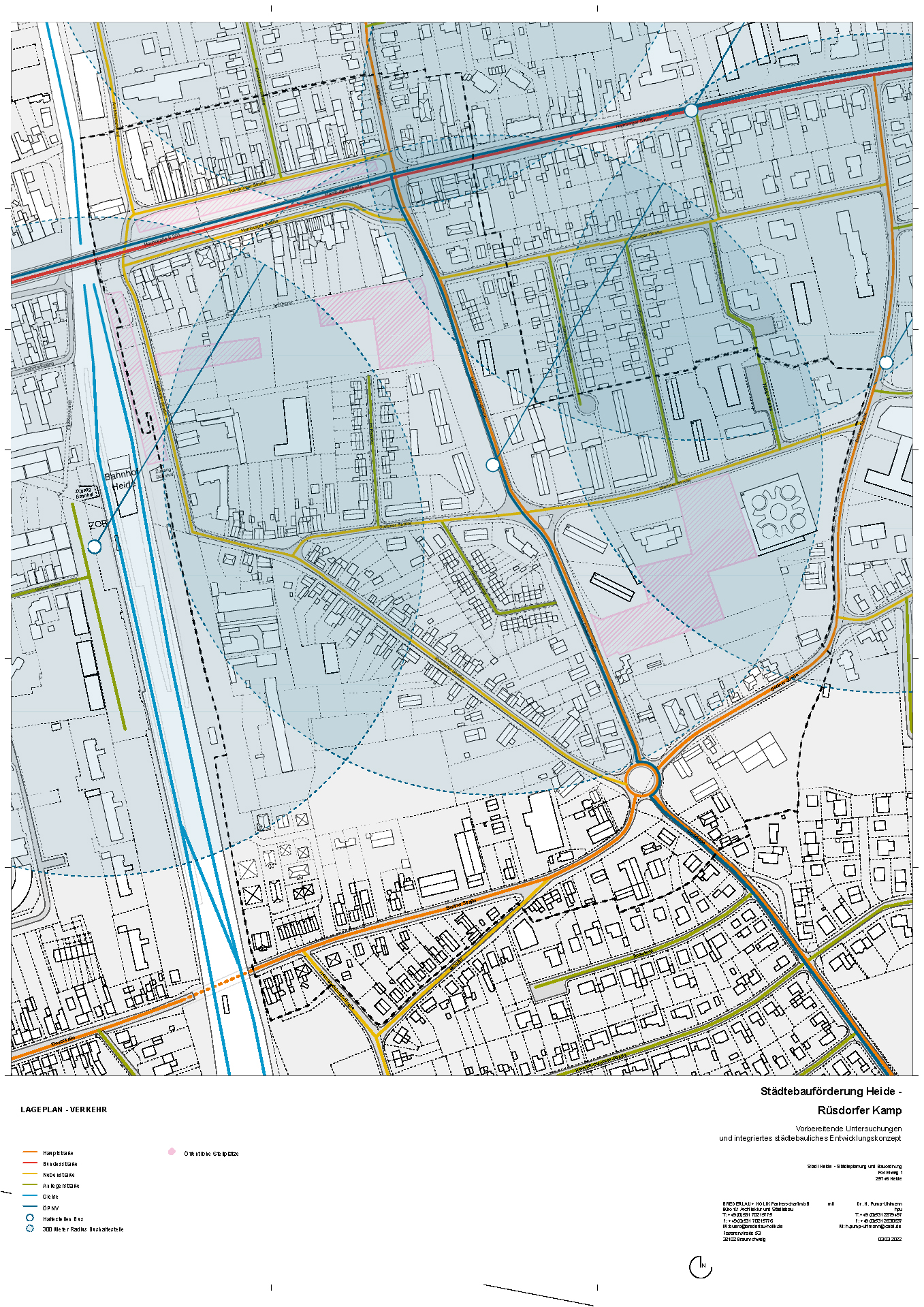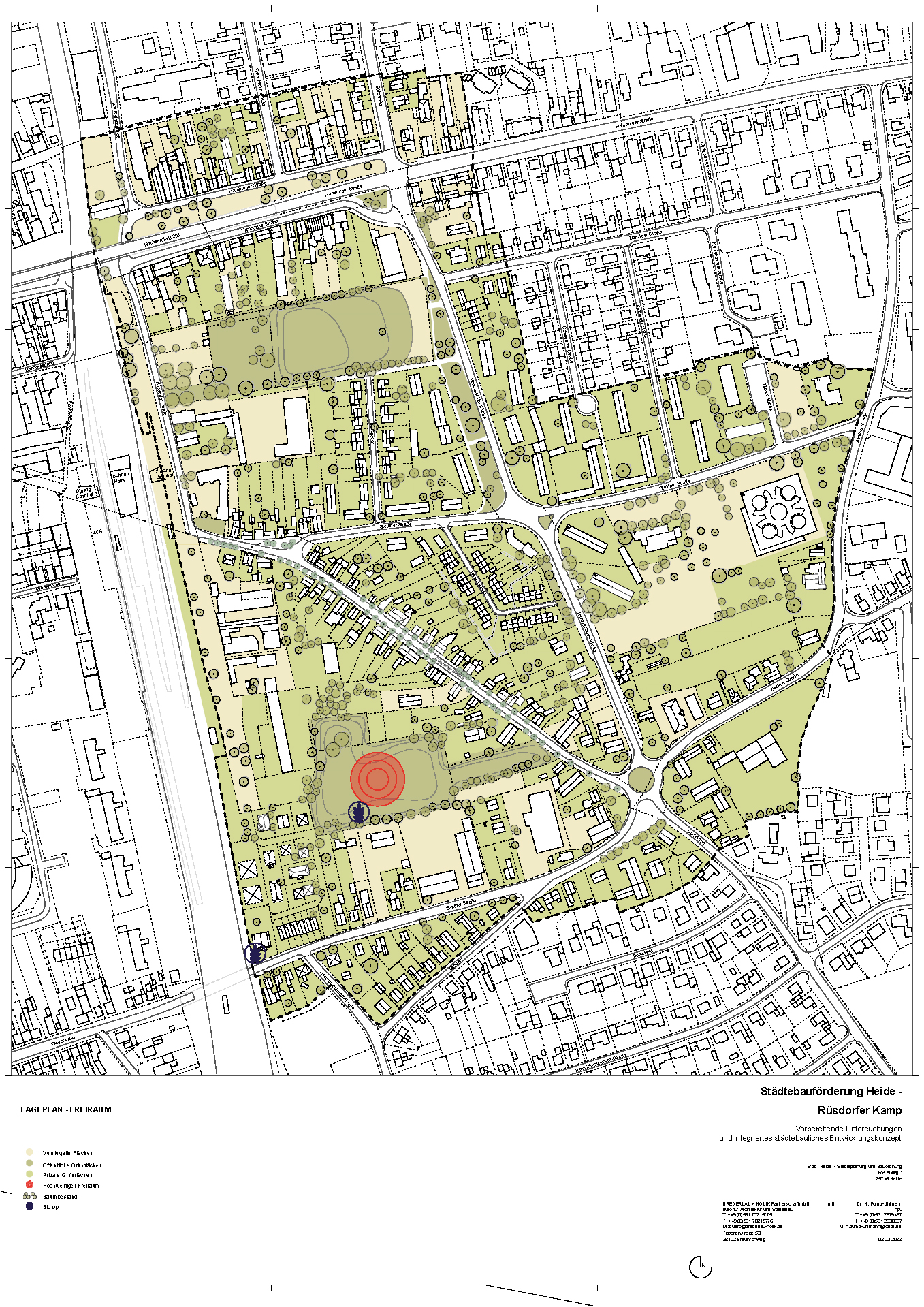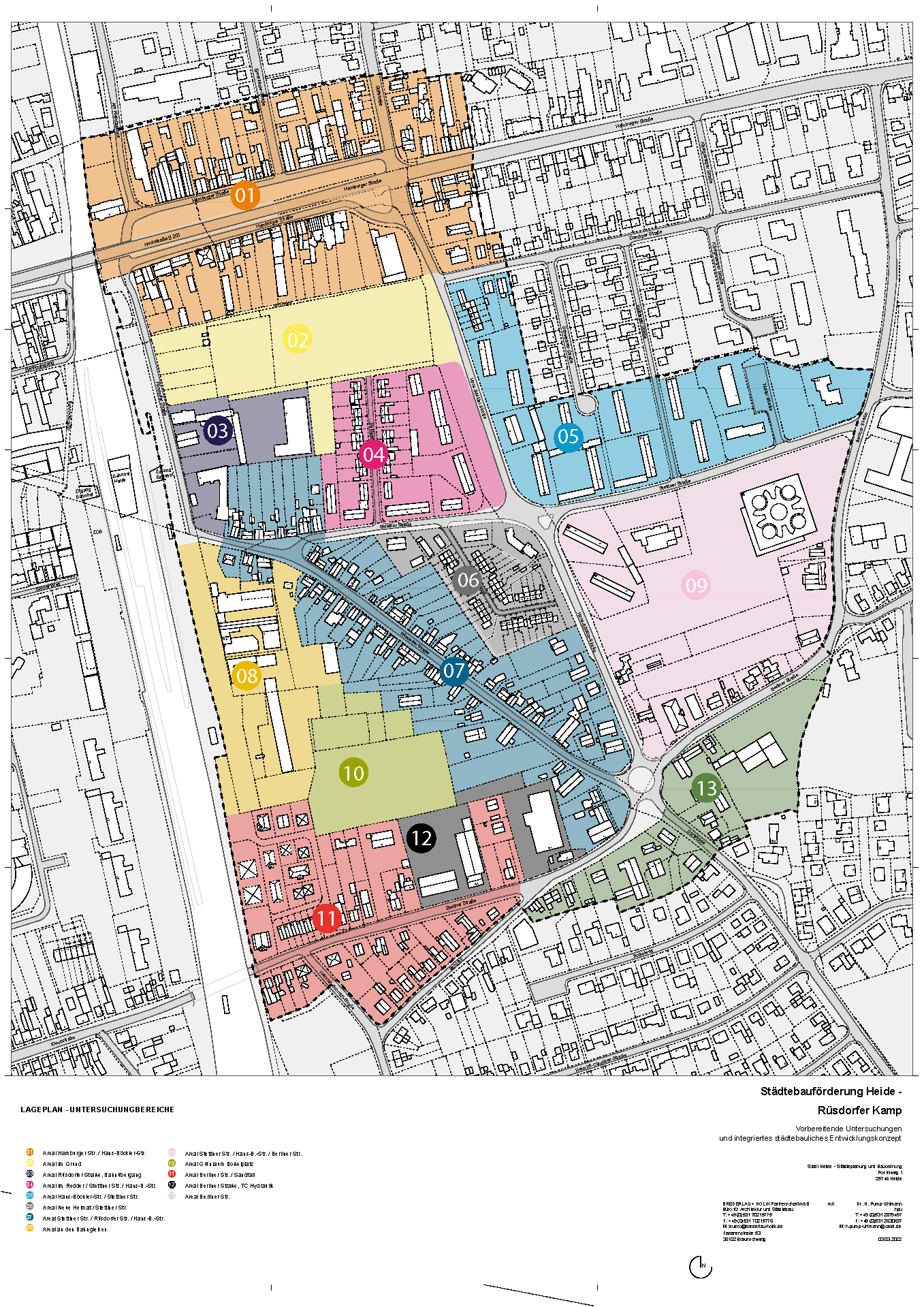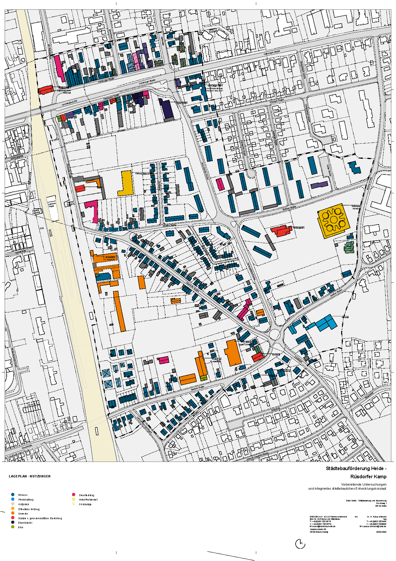 Das insgesamt ca. 32 ha große Untersuchungsgebiet „Rüsdorfer Kamp“ befindet sich in direkter Nähe zur Innenstadt von Heide. Aufgrund seiner Lage und guten Anbindungen hat das Quartier ein großes Entwicklungspotential. Trotz seiner Lagegunst wird das Quartier durch Barrieren wie die angrenzende Bahntrasse und die Hochstraße B 203 massiv beeinträchtigt.