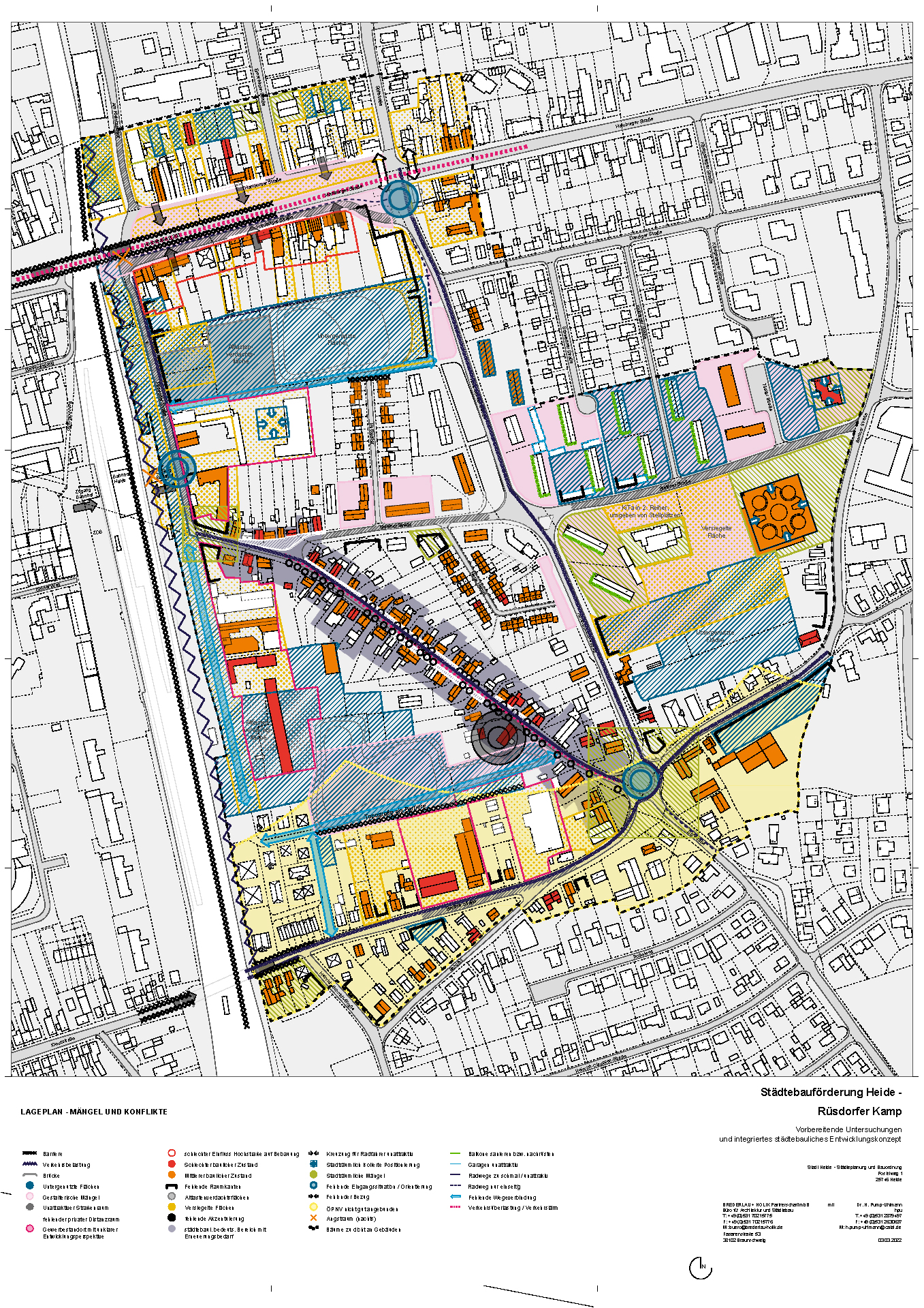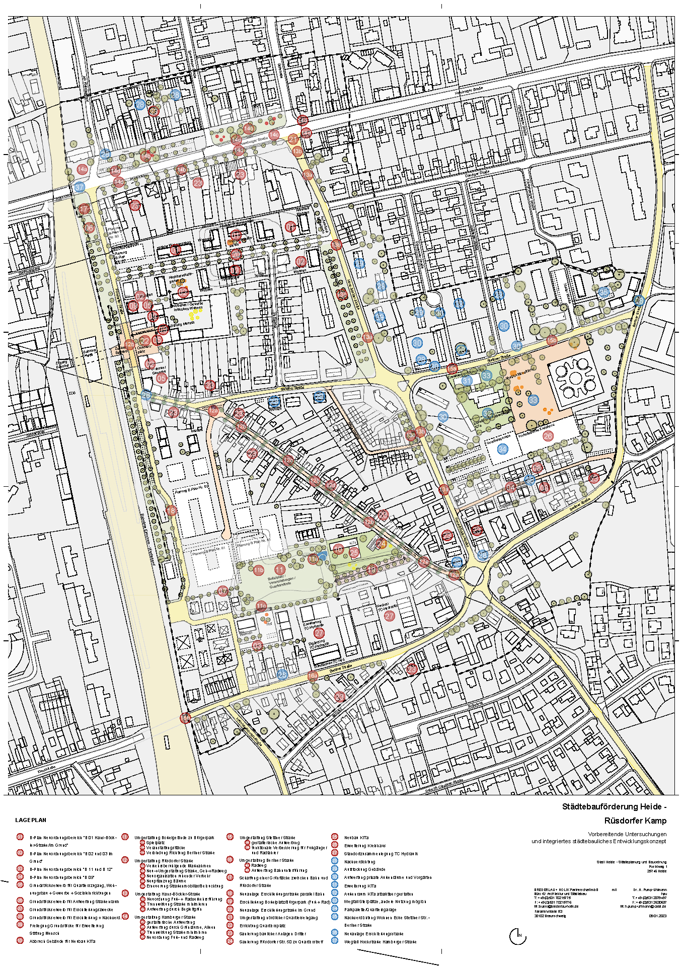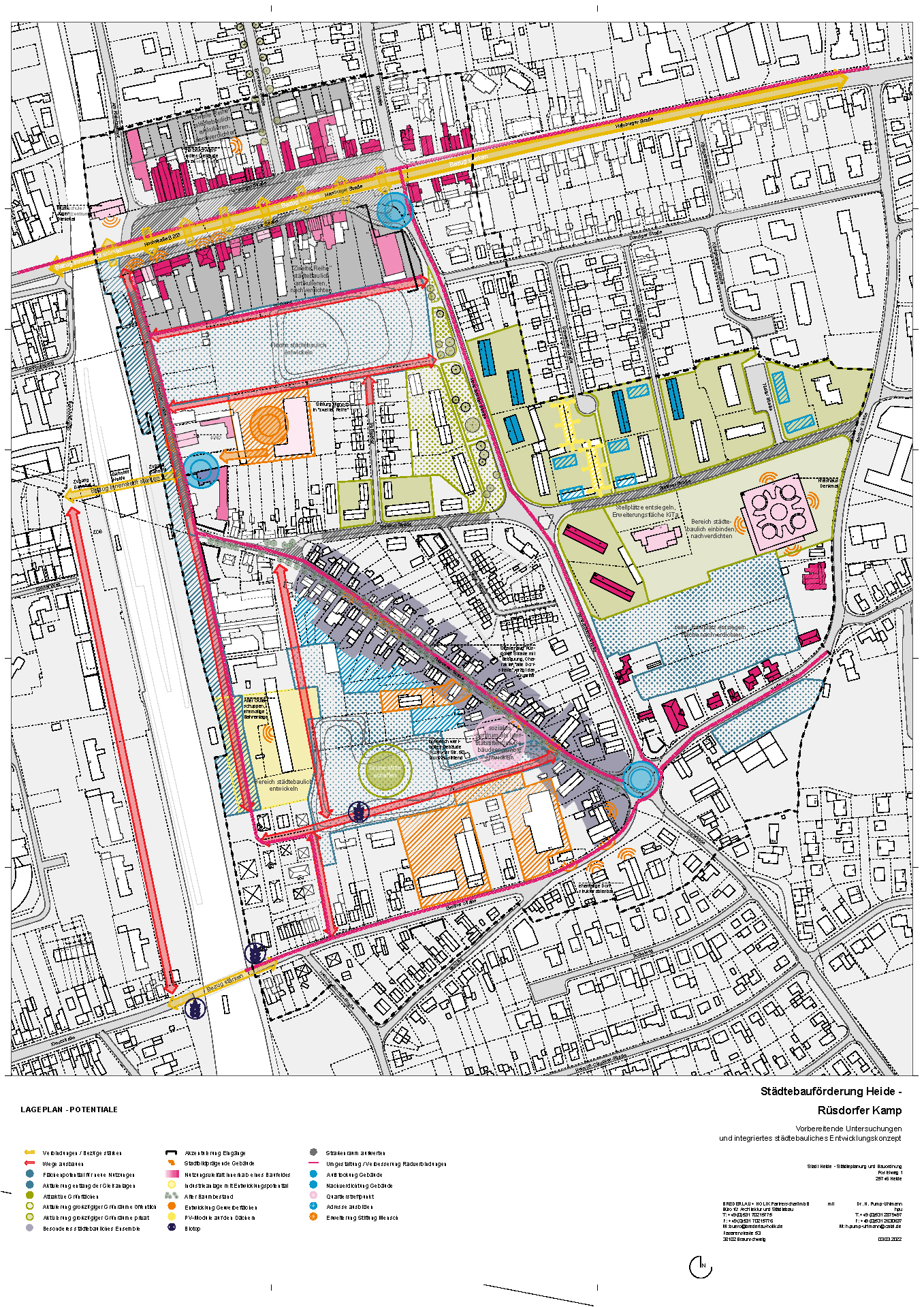 Das insgesamt ca. 32 ha große Untersuchungsgebiet „Rüsdorfer Kamp“ befindet sich in direkter Nähe zur Innenstadt von Heide. Aufgrund seiner Lage und guten Anbindungen hat das Quartier ein großes Entwicklungspotential. Trotz seiner Lagegunst wird das Quartier durch Barrieren wie die angrenzende Bahntrasse und die Hochstraße B 203 massiv beeinträchtigt.