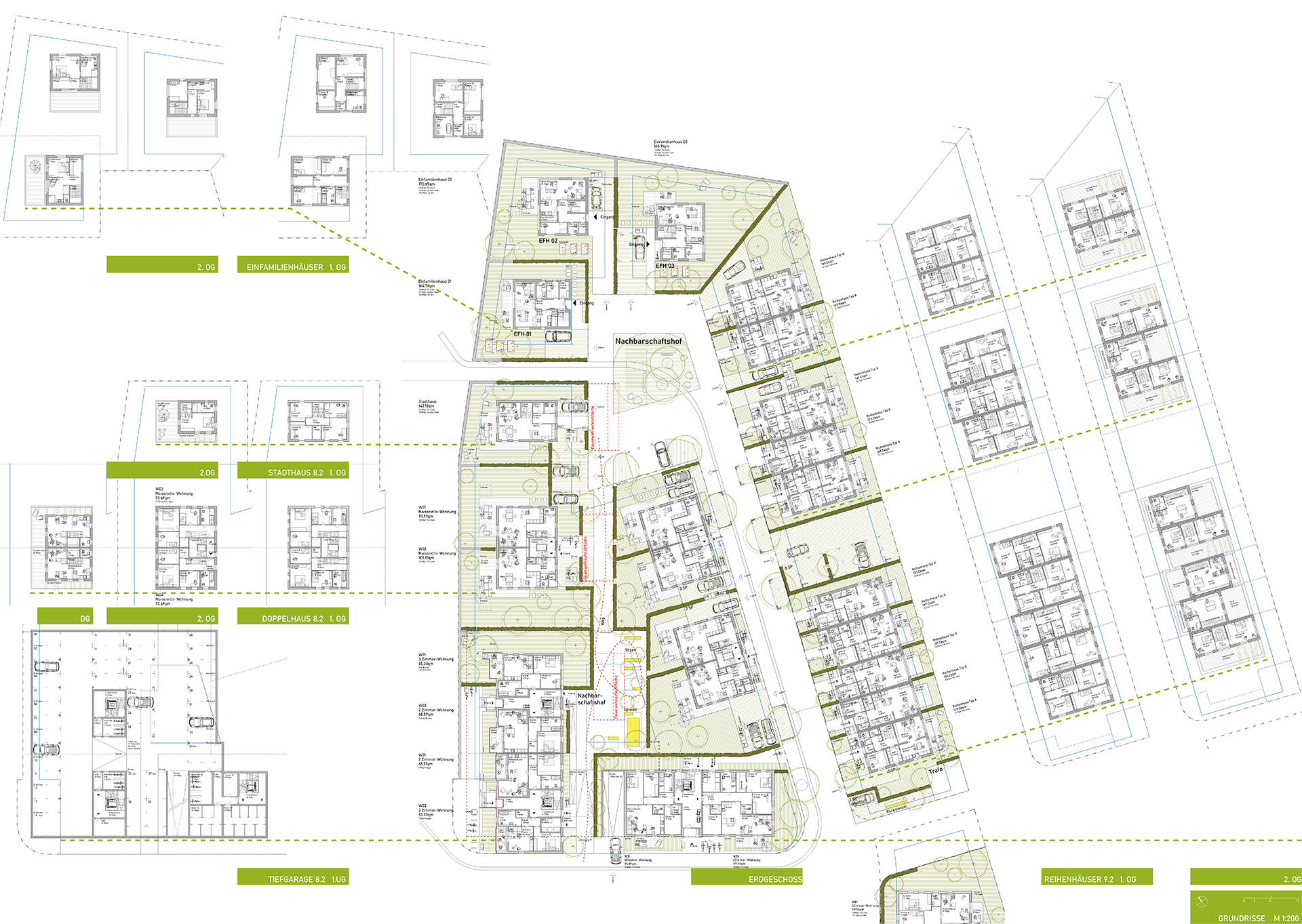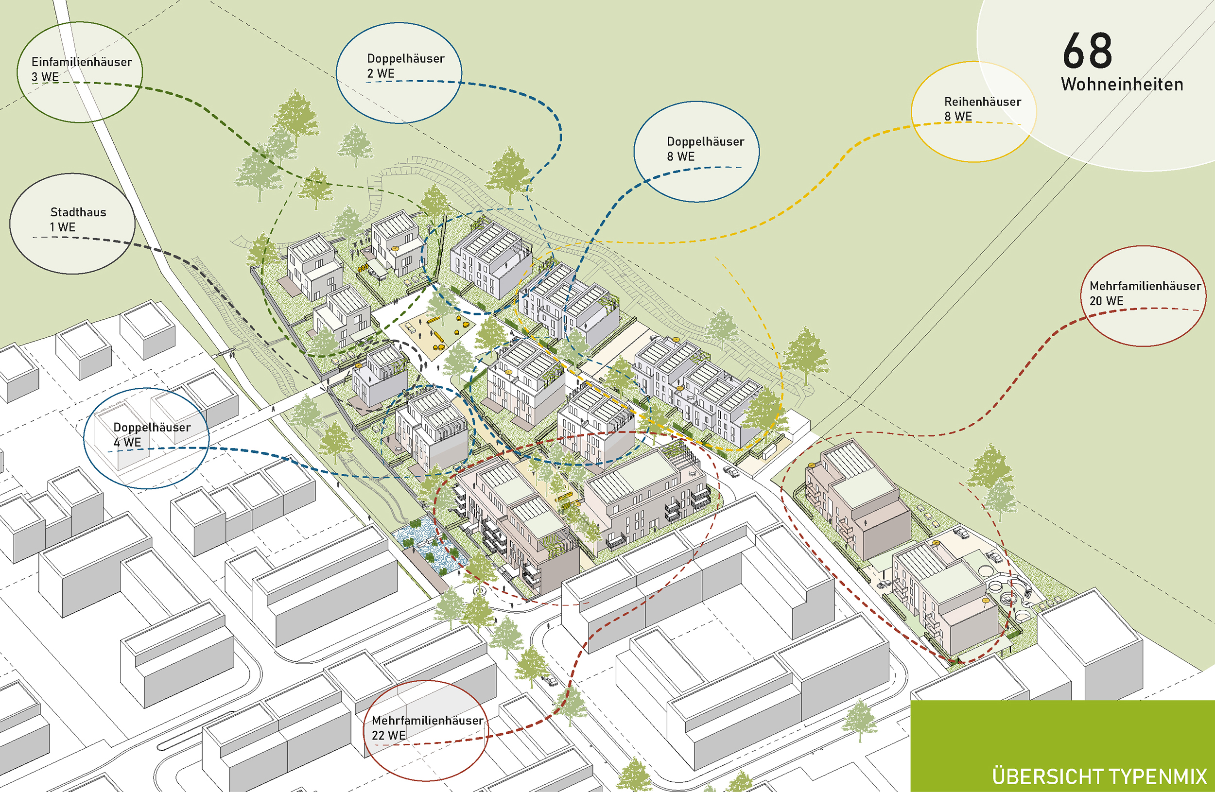 Das Ensemble reagiert differenziert auf Lage und Umfeld: Auf 9.1 entstehen zwei markante Wohngebäude mit repräsentativer Wirkung und Schallschutzmaßnahmen. 9.2 bietet mit Reihen-, Doppel- und Einzelhäusern eine abgestufte Bebauung, die sich zur Landschaft hin öffnet. 8.2 schließt mit Stadthäusern und Geschosswohnungsbau den Quartiersplatz und schafft die Verbindung zum öffentlichen Raum. So entsteht eine klare städtebauliche Dramaturgie von Urbanität zu landschaftlicher Offenheit.