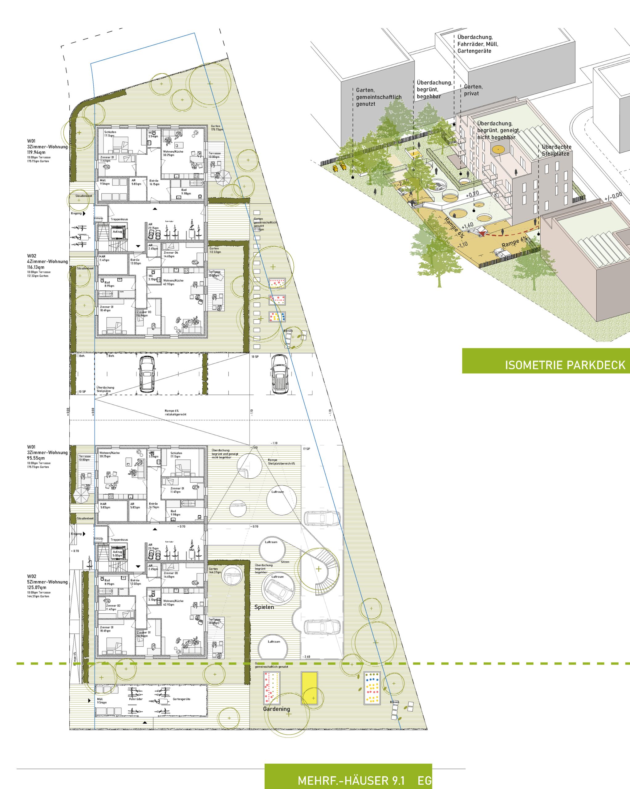 Zwei miteinander verbundene Höfe – ein zentraler und ein kleinerer an 8.2 – bilden das grüne Herz der Nachbarschaft. Sie schaffen Orte für Begegnung, Spiel und Ruhe in fein abgestufter Privatheit. Hainbuchenhecken, Staudenpflanzungen und kleine Mauern strukturieren die Gärten. Das abgesenkte Parkdeck auf 9.1 wird als gemeinschaftlich nutzbarer Garten gestaltet und bildet einen grünen Übergang in die Landschaft.