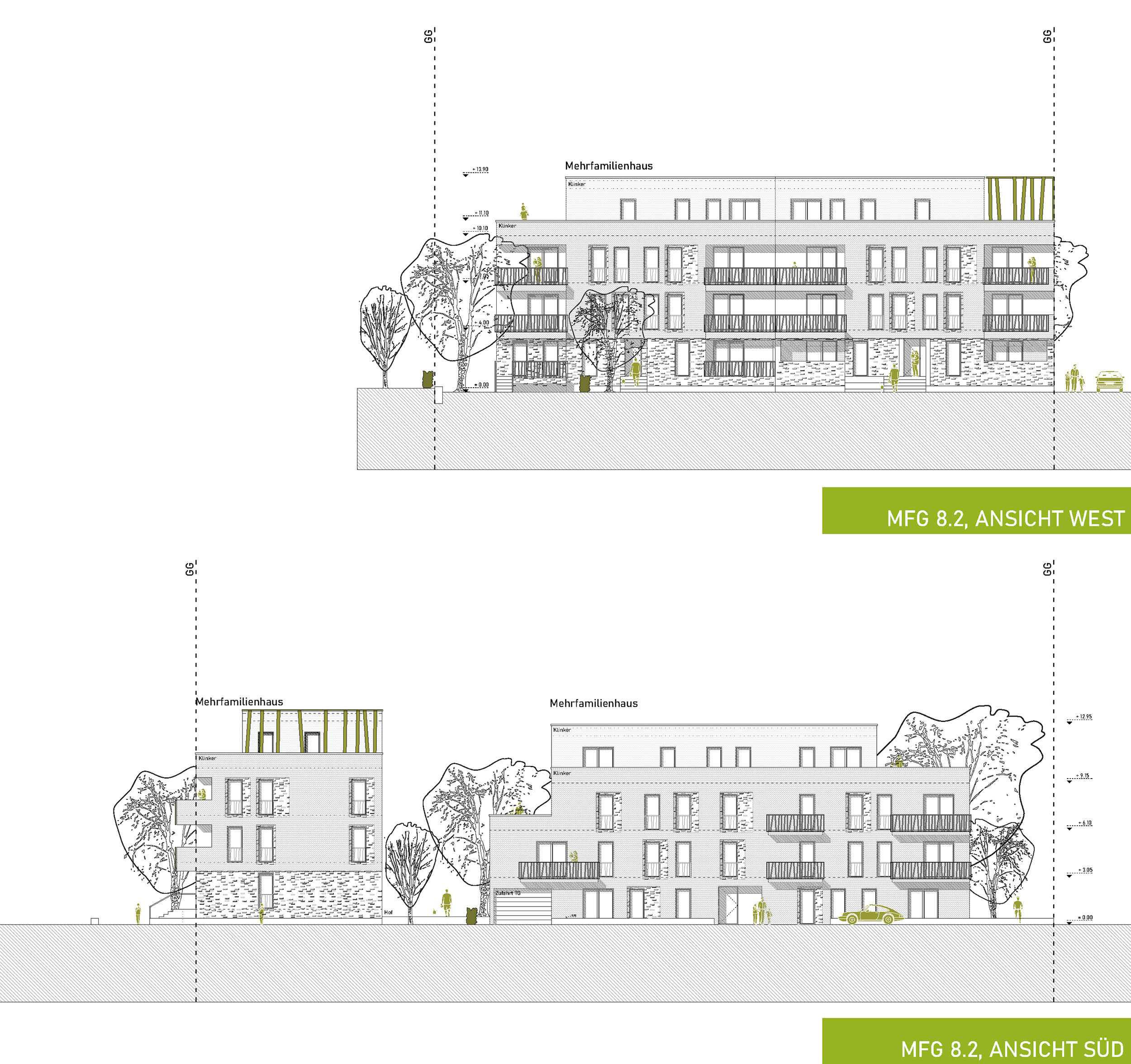 Die Materialität folgt der Typologie: Geschosswohnungsbauten erhalten Ziegelfassaden in warmen Farbtönen, Reihen- und Doppelhäuser Putzfassaden mit plastisch ausgebildeten Faschen. Massive, langlebige Bauweisen mit mineralischen und natürlichen Materialien sichern Qualität, Robustheit und gute Alterungsfähigkeit.